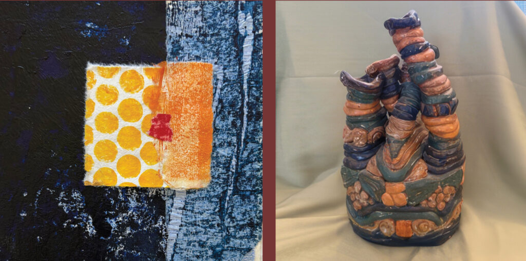 Through wood-glazed sculpture, hand-built pottery, monotype, hand printing, chine collé, and collage, the exhibit highlights the expressive possibilities that emerge when materials are shaped, built up, marked, and transformed. Across both artists’ work, form is never separate from surface. Instead, texture, line, and layers of color become essential to how each piece is experienced, inviting viewers to look closely and discover subtle relationships between structure and design.