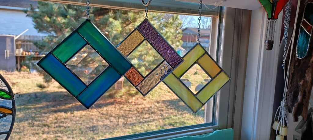 You’ll create a geometric window piece featuring a dazzling pre-cut beveled glass center that catches and reflects the light beautifully. Around that sparkling focal point, you’ll design and build your own colorful square frame.