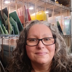 Our instructor, Mary Haycraft, has called southern Indiana her home since 2001. She currently lives in Jeffersonville, Indiana where she works from her home-base glass studio with her cats Marsha & Tori and dog Ramey. Haycraft was drawn to stained glass at an early age sitting in a pew at church and watching the beautiful colors play off the floor from the stained-glass windows. She said “it was so peaceful and beautiful I knew I wanted to work with glass.”